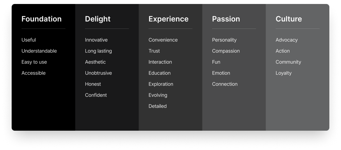 Before we go layer by layer, here’s the shape of it: Usability → Delight → Experience → Passion → Culture. Each layer depends on the one below it. A product that skips the foundation in pursuit of the capstone collapses. And a product that stops at the foundation is forgotten the moment something marginally better comes along.